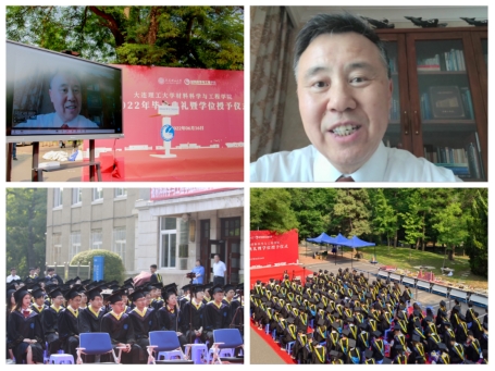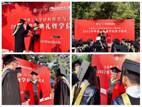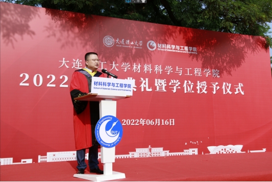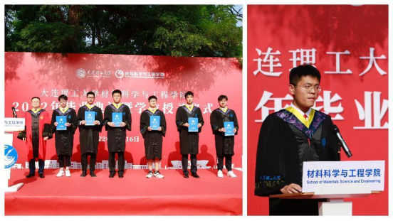 典礼上为2022届毕业生班级联络人颁发聘书,更好地建立毕业生和母校之间的联系。毕业生代表、材1804班申浩阳同学发言,他深情地回忆了在大工四年的学习时光,表达了对母校的眷恋、对同学的祝福,同时以及“强国有我、在青春的赛道上奋力奔跑”的决心。
