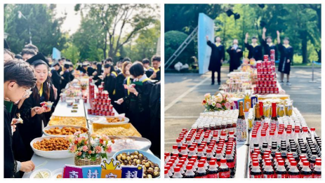 典礼结束后,9999js金沙老品牌2022届毕业冷餐会正式开始。定制版毕业小饼干、无限续杯的饮料、蛋糕、水果、充满童年回忆的小零食……。辅导员带着志愿者们铺红毯、架喷绘、布置场地、陈列美食……在符合疫情防控的政策下,给毕业生亲手打造100%的甜蜜。同学们在歌声中回忆青春、互道珍重,合影留念,在厚义楼前林荫下,清风作伴,好友相陪,将所有的不舍和思念娓娓道来。