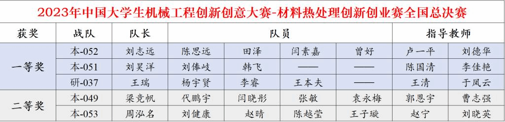 2023年7月15日-16日,中国大学生机械工程创新创意大赛——材料热处理创新创业赛总决赛在江苏科技大学举行。我院5支队伍在副院长陈国清教授和中国机械工程学会热处理分会理事王清教授的带领下,在学院大赛组委会老师的悉心指导下,认真备赛,精诚协作、攻坚克难。最终在与110所高校的225支队伍同台竞技中斩获佳绩。其中3支队伍获全国一等奖,2支队伍获全国二等奖,展现了大工材料学子的风采。