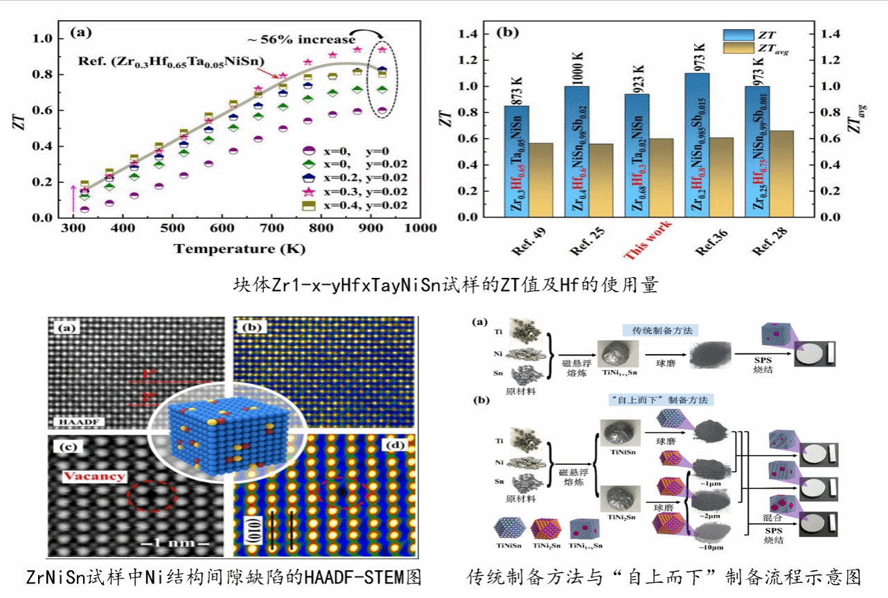 热电器件根据载流子输运特性能够直接将热能和电能进行相互转化,并且具有无噪声、无移动部件、体积小和长寿命等优点。MNiSn(M = Ti,Zr)基half-Heusler(HH)合金是一种热电性能和力学性能优异的热电材料,具有广阔的商业化应用前景。杨雄博士在王同敏教授和康慧君教授的共同指导下,提出了“斜对角掺杂策略”,成功制备出了高性能低成本的N型HH合金,有效降低了Hf的使用量。首次采用HAADF-STEM直接观察到了ZrNiSn合金中Ni间隙结构缺陷的存在,为ZrNiSn合金中存在的缺陷类型提供了直接证据。针对传统方法制备HH试样时,自生成的full-Heusler(FH)第二相尺寸、形貌和分布不易控制的难题,创新性的将“自上而下”法用于制备HH热电材料,实现了HH试样中FH第二相大小和分布的有效调控。