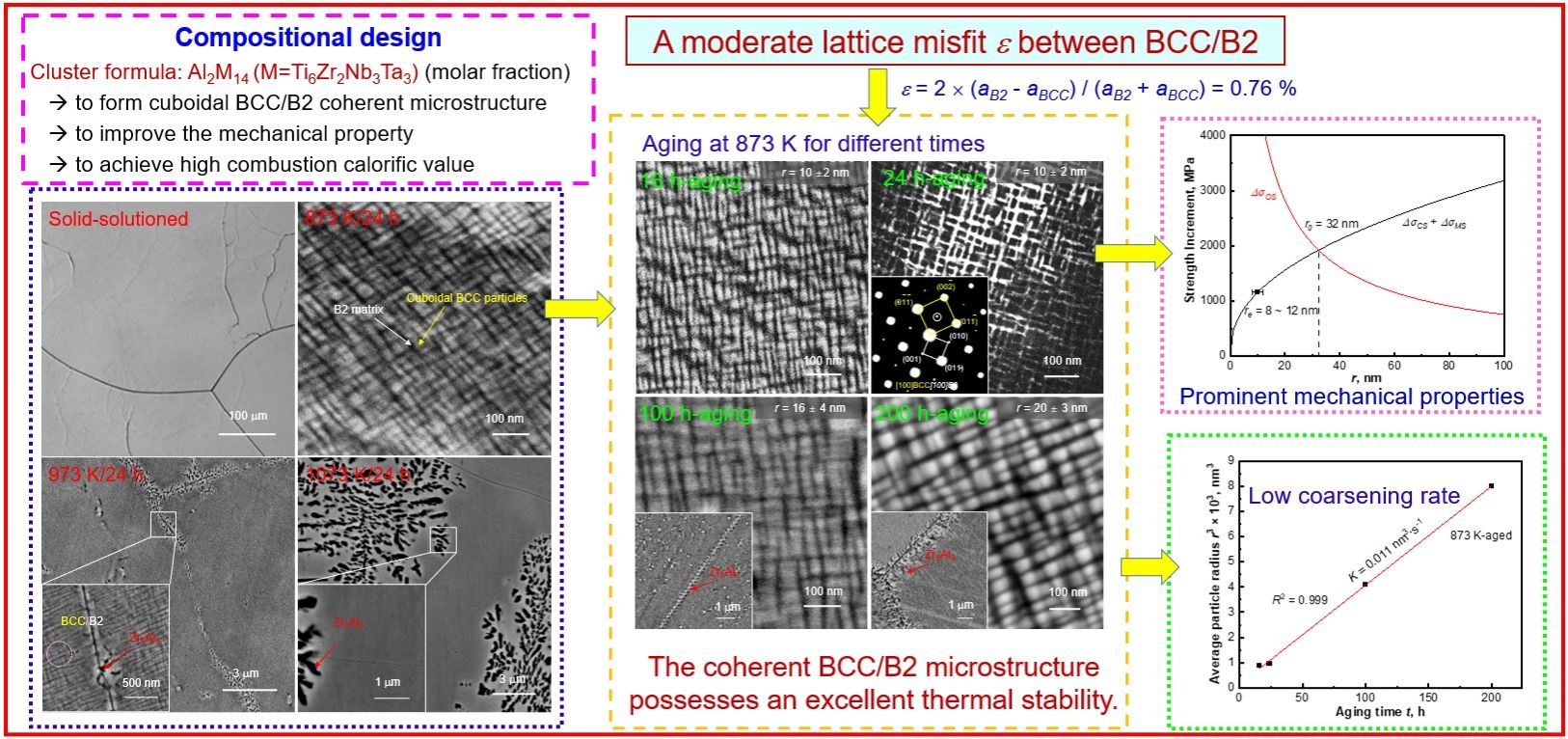 金东明硕士利用团簇式成分设计方法在Al-Ti-Zr-Nb-Ta难熔高熵合金体系实现了对BCC/B2共格组织的设计与调控,获得了具有高稳定性的方形BCC/B2共格组织的高熵合金,具有优异的强塑性和高的放热焓,实现了合金结构-功能一体化设计,为发展新型高性能含能结构材料提供了全新思路。