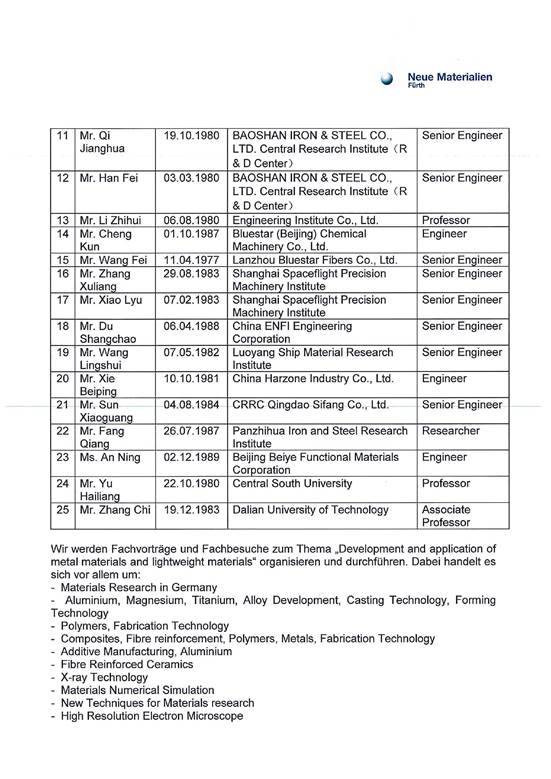申请人获批参加2018年新材料人才培养计划中的金属材料及轻量化材料开发与应用培训班,为工业和信息化部、国家外国专家局联合举办,培训地点为德国福特新材料研究院,时间30天,全英文授课,由国家出国培训专项经费按规定标准资助境外部分费用。该培训面向全国重点院校和科研院所发布,共筛选来自中科院、各高校及科研单位25人参加本次人才培训。培训内容为金属材料及轻量化开发与应用方面的专业培训和专业访问。