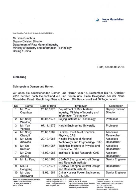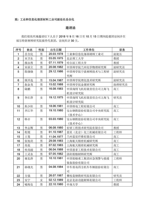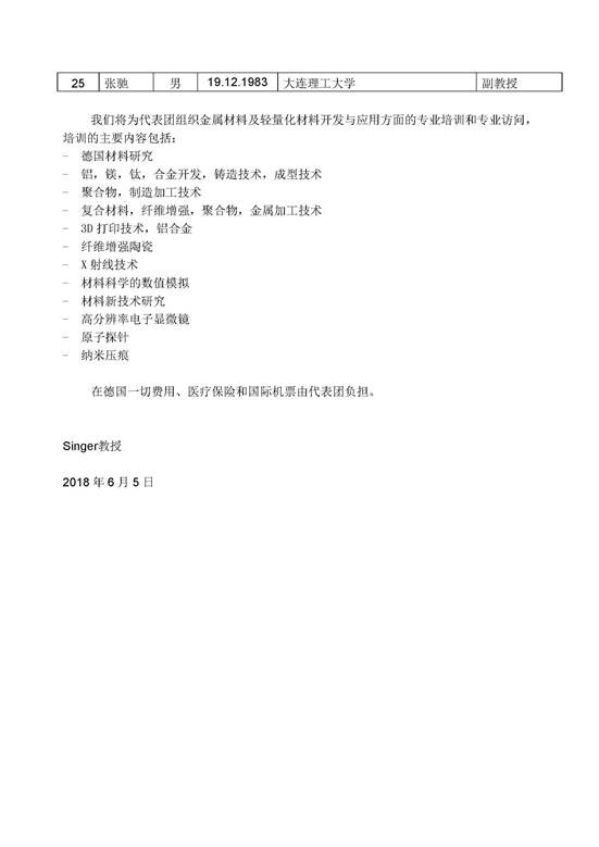 应德国福尔特新材料研究院总经理Singer教授邀请,我单位张驰拟赴德国进行工作访问(培训)。现将该团组拟出访情况公示如下: