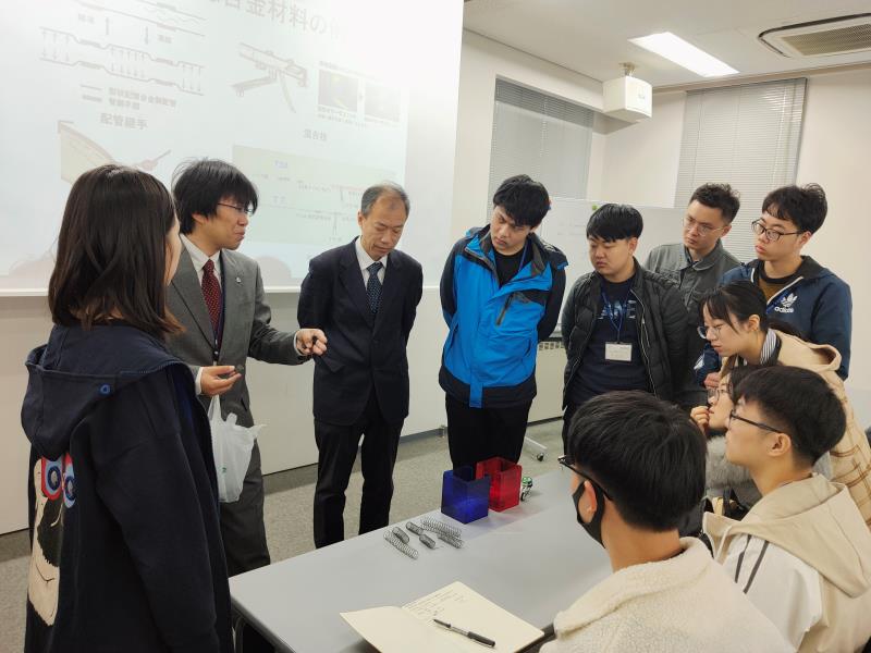 第三天整个上午的日程安排是模拟课程体验。寺井教授和安田教授分别用日语授课。寺井教授讲授了马氏体相变和形状记忆合金的内容,并带来了一些样品试验演示马时相变合金在不同温度下形状的变化。安田教授介绍了电子封装相关的内容。同学们日本语功底扎实,不但听得懂,而且还不断提问问题,并得到教授耐心细致的解答。