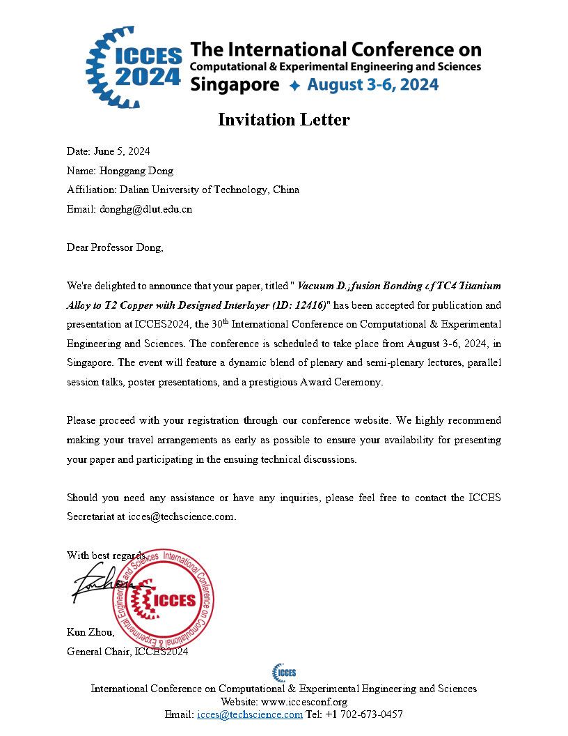 第三十届计算与实验科学工程国际会议(ICCES 2024)将于2024年8月3-6日在新加坡召开。受大会主席Kun Zhou教授邀请,本人拟参加该会并作邀请报告“Vacuum Diffusion Bonding of TC4 Titanium Alloy to T2 Copper with Designed Interlayer”。作为一个重要的学术平台,ICCES一直以促进计算与实验科学工程的跨领域交流与合作为己任,为科学的进步不断注入新的动力。ICCES2024的主题涵盖了众多前沿研究领域,包括但不限于复合材料、软物质、软体机器人、柔性电子、力学、机器学习、3D/4D打印、智能制造、能源储存与转换、以及环境和水处理等。ICCES2024热切期待全球专家学者的积极参与,分享与交流最新的研究成果。