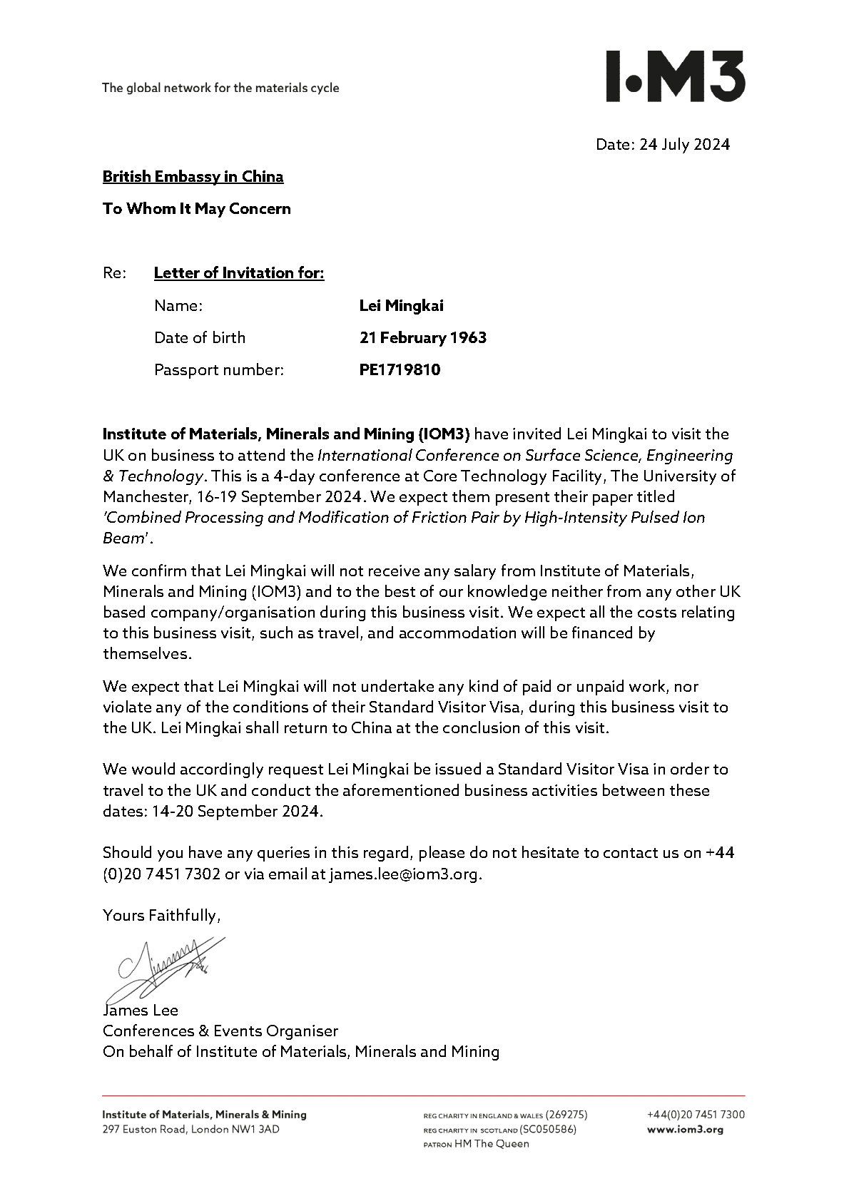 2024-09-16 | 英国 | 英格兰 曼彻斯特 | 参加1st International Conference on Surface Science, Engineering & Technology |