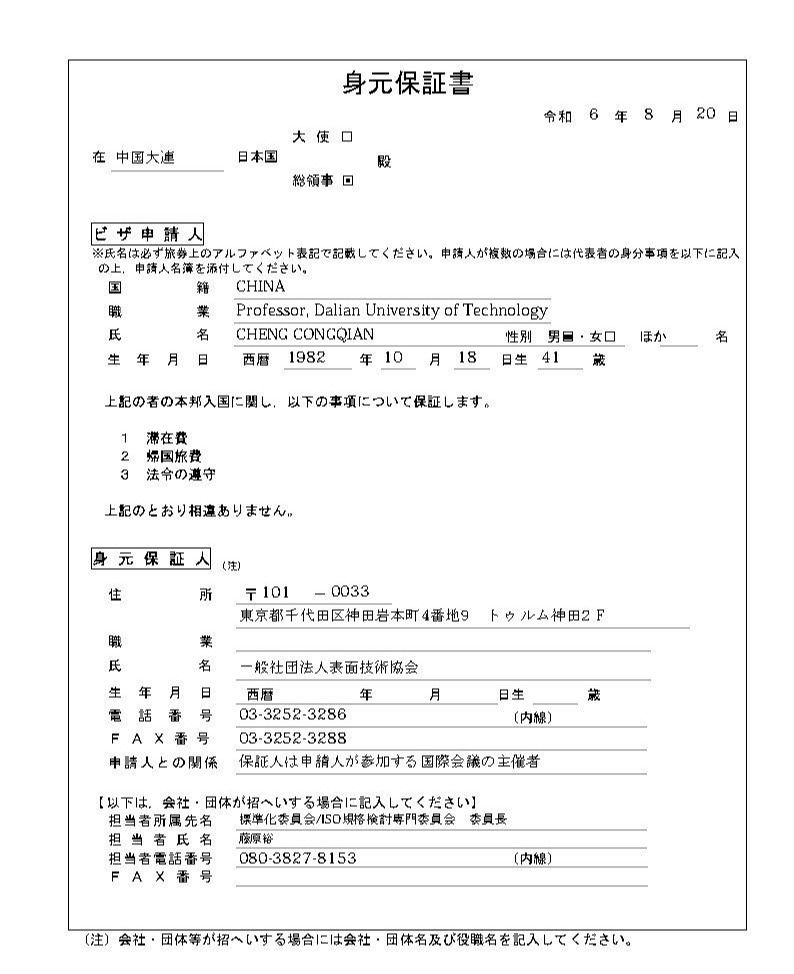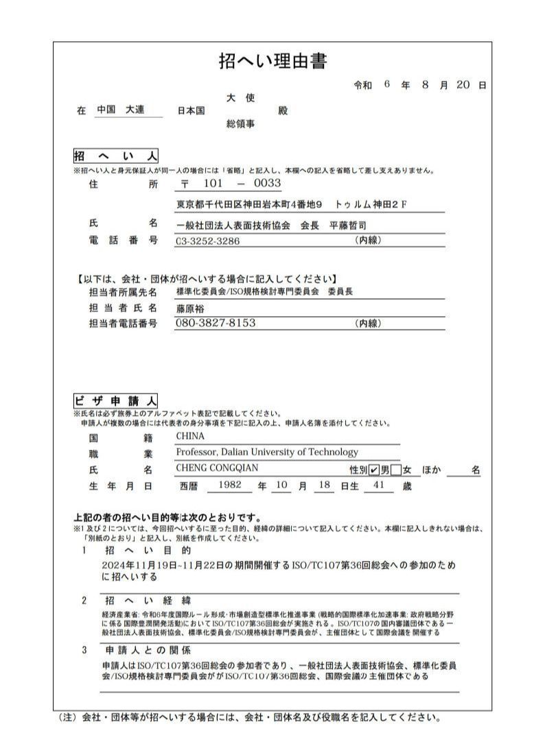 应ISO规格讨论专门委员会邀请,我单位程从前拟赴日本进行学术访问。