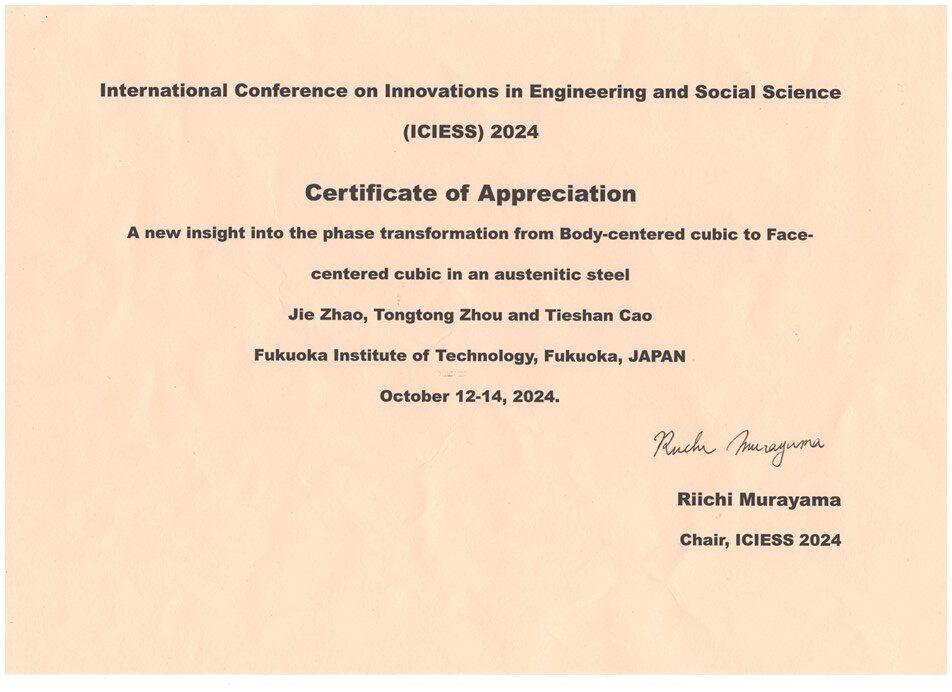 2024年10月12日至10月15日,9999js金沙老品牌赵杰教授受邀赴日本福冈参加了International Conference on Innovations in Engineering and Social Science (ICIESS2024)会议。