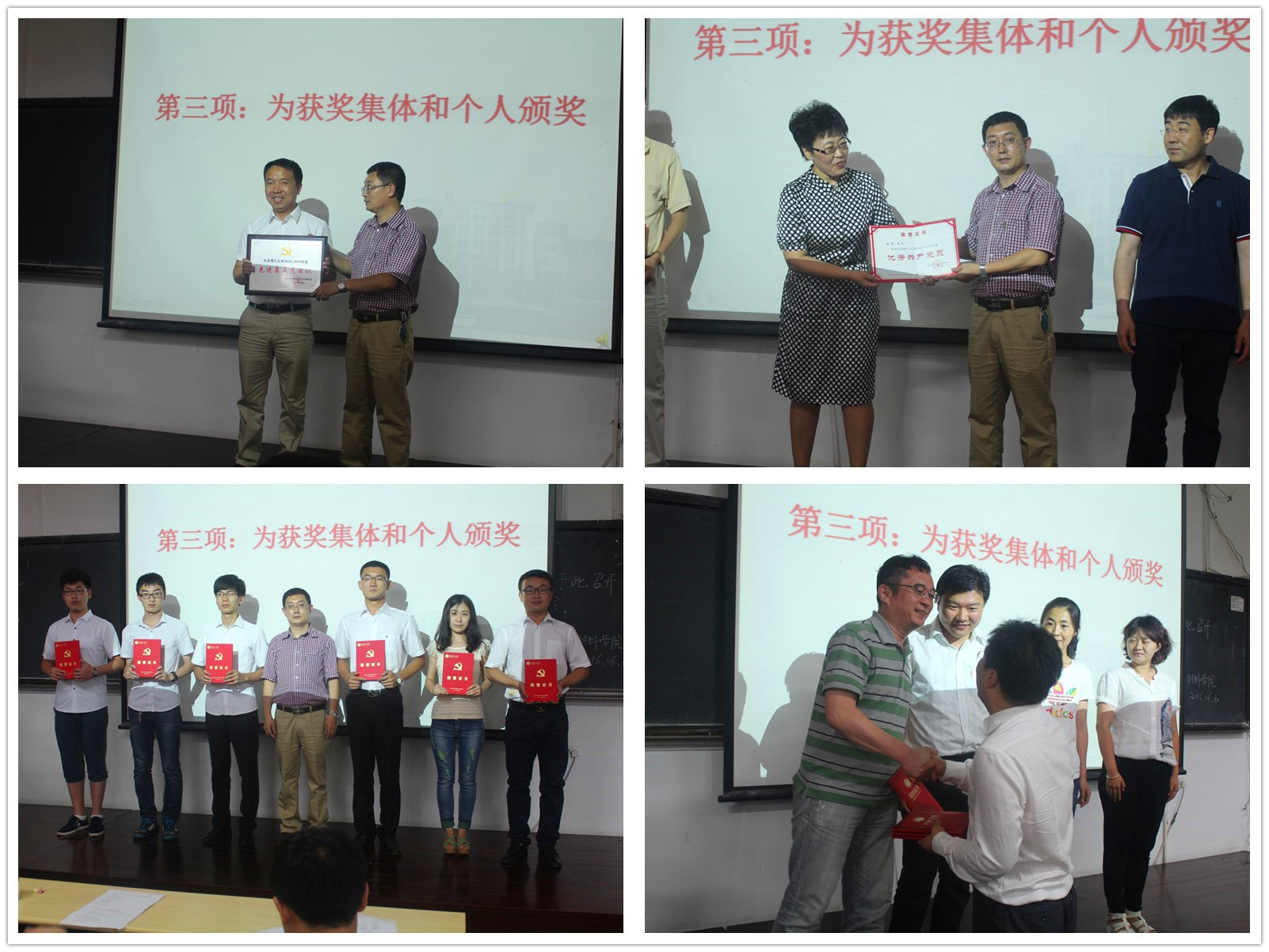 大会在雄壮的国歌中开启,学院党委书记王同敏宣读了表彰名单,共20名优秀共产党员、5名优秀党支部书记、6个先进党支部、6个党章党规知识竞赛优胜代表队,以及5位在学校“学习毛丰美”主题征文中获奖的选手获得表彰。其中,在学院“两优一先”的评比中,考虑到不同岗位教工党员工作性质有所不同,不同年级、不同发展阶段学生的个性化发展需要,分别评选出“科研攻关型”“育人模范型”“爱岗敬业型”3类教工优秀共产党员各2名,评选出“学习型”“实践型”2类学生优秀共产党员各3名,以资鼓励。在欢快的音乐声中,王同敏、苏克治、黄昊3位班子成员分别为获奖人员颁发了奖牌和证书。