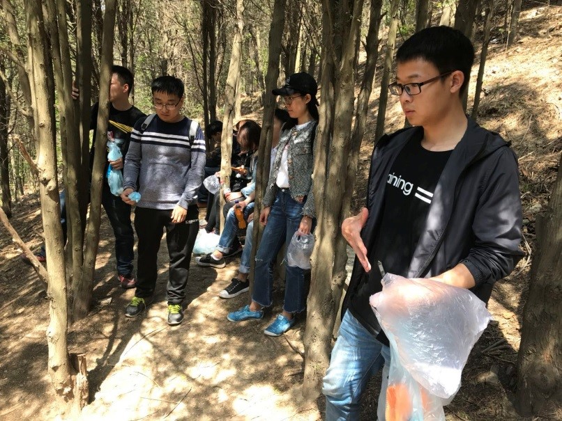 在重点发展对象培训考试之后,所有人员于材料馆门前集合,小组长安排清扫区域,强调安全注意事项。接着带领大家来到牛角山,在分配好垃圾收集袋后开始积极清理垃圾。在清理途中,小组长发现有两名学员身体不适但仍然坚持参加公益活动。她们说:不能因为个人因素,影响团队活动的进行。最后考虑到学员身体,小组长劝说原路返回。在互相搀扶下,两位学员平安回程。这时我们的先锋队已经在短短的时间内,到达半山腰,由于今天天气晴朗,烈日高照,大家中途休息。男学员积极的为女学员让坐,并相互询问大家体力情况,片刻休息后,各位学员再次充满了干劲儿,继续向山顶出发。学员们不怕脏,难清除的垃圾就直接下手清理;学员们不怕累,不断的弯腰,伸手,不容易够到的垃圾一个人把持平衡,另外一个人去捡。最终,在大家齐头并进的势头下,完成了这次公益活动。最后,在牛角山顶与此次的“战利品”合影留念。