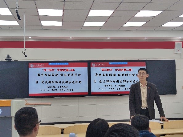 文献阅读能力是研究生的基石,也是时间管理在科研落地生根的体现。如何提高文献查询效率、更好的利用和规划时间是研究生的重中之重。为此,支部开“聚焦文献阅读,做好时间管理”特色主题活动,邀请朱小鹏老师作为嘉宾莅临指导,同时邀请优秀博士生党员史思琪同志、优秀博士生积极分子张书姣同志、优秀硕士生党员宋绍坤同志于文献阅读、管理等方面给予意见和经验分享,本次主题活动的内容主要是如何提高文献查询效率,重点文献阅读网站、各个方向上的重点国内外期刊等。会上朱小鹏老师给予了建议和指导,指出文献在科研中的重要性,研究生要经常读、反复读经典文献,并肯定了活动的意义。活动过程中支部内成员认真学习并做好笔记,本次活动取得圆满结束。
