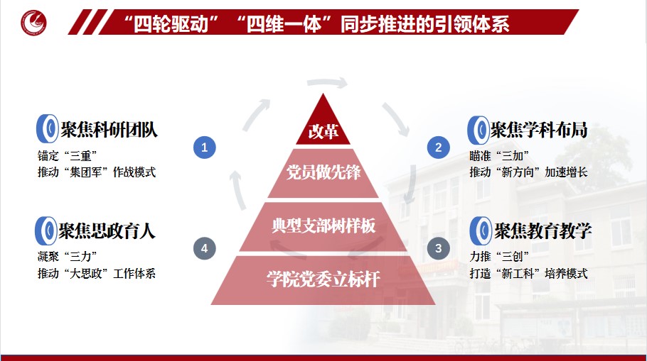 学院以“党建铸魂赋能”为内涵,以“学科冲A,建设世界一流材料学科”为根本,通过科研团队整合、学科布局调整、教育教学创新、思政育人协同,在“加速跑”中形成“学院党委立标杆”“典型支部树样板”“党员骨干做先锋”“全面改革促跨越”的“四轮驱动”、“四维一体”同步推进的党建引领体系,谋划了“大平台-大项目-大人才-大成果”的“集团军”式创新、“郭可讱荣誉计划(实验班)”创新、聚焦智能+、新能源+、新材料+新方向攻关等系列举措。
