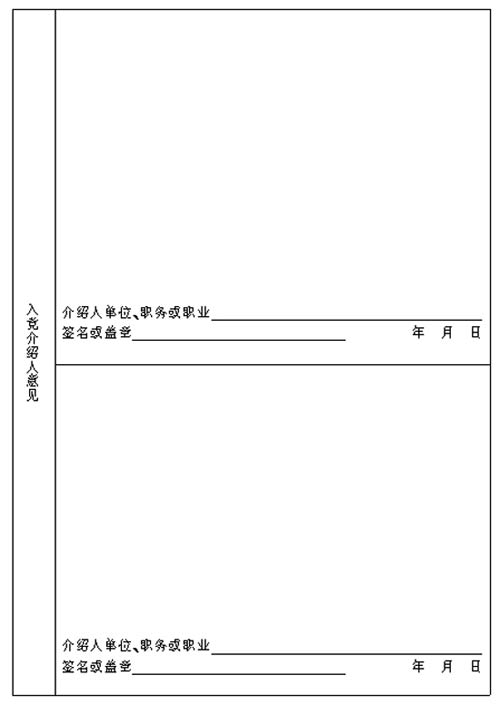 13.“入党介绍人意见”,填写介绍人了解和掌握的申请人的入党动机、思想品质、现实表现等情况,对是否同意其入党表明意见。