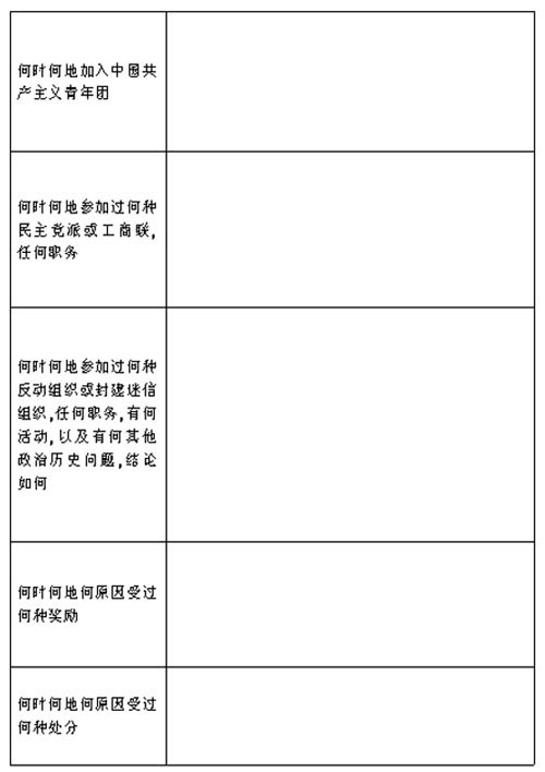 9.“何时何地加入中国共产主义青年团”、“何时何地参加过何种民主党派或工商联,任何职务”和“何时何地参加过何种反动组织或封建迷信组织,任何职务,有何活动,以及有何其他政治历史问题,结论如何”中的“何地”,应填写到工作单位或乡镇、街道。