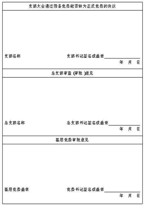 14.“支部大会通过接收申请人为预备党员的决议”,填写参加大会的具有表决权的正式党员数、讨论的情况、采取的表决方式、表决结果等。