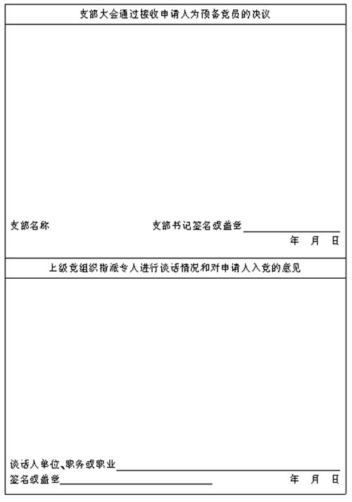 15.“上级党组织指派专人进行谈话情况和对申请人入党的意见”,填写党委委员或组织员通过谈话了解到的申请人的入党动机是否端正,对党的基本知识是否了解,入党手续是否符合规定,谈话人对申请人是否具备党员条件和是否同意其入党的意见等内容。